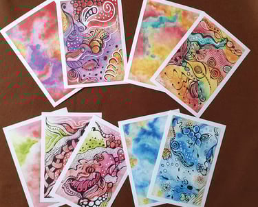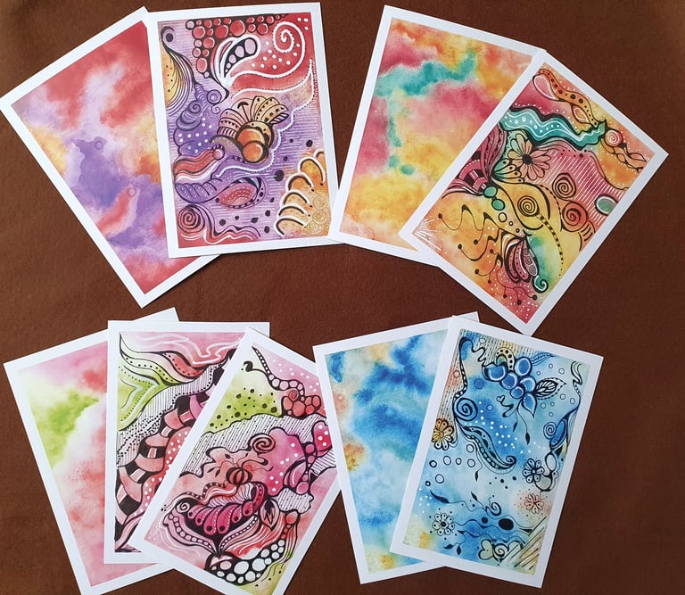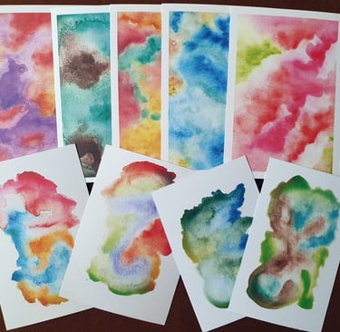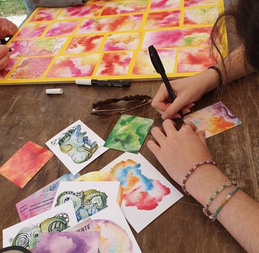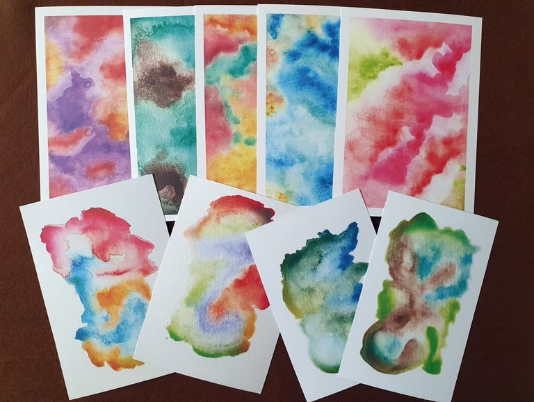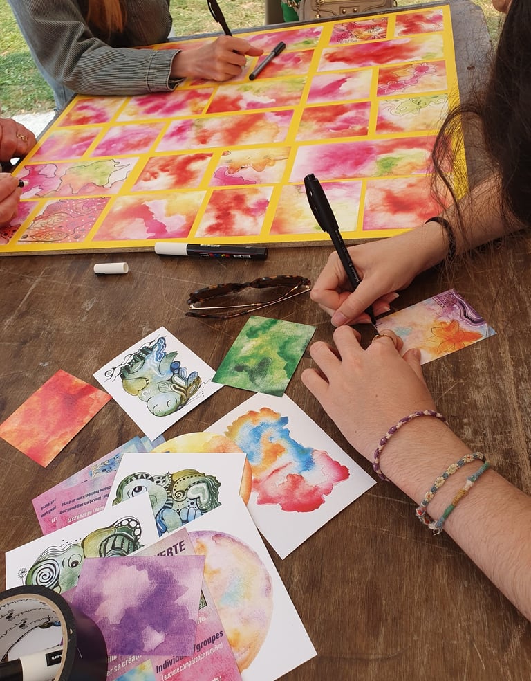 Afin de vous familiariser avec le coloriage inversé, je vous invite au début de l'atelier à choisir une des nombreuses cartes mises à votre disposition. Les fonds réalisés à l'aquarelle sont reproduits sur du papier de qualité qui permet le coloriage au feutre. Laissez-vous simplement inspirer par la couleur, les fondus, les formes ou simplement votre instinct, sans réfléchir à ce que vous allez faire. Ne vous imposez rien !